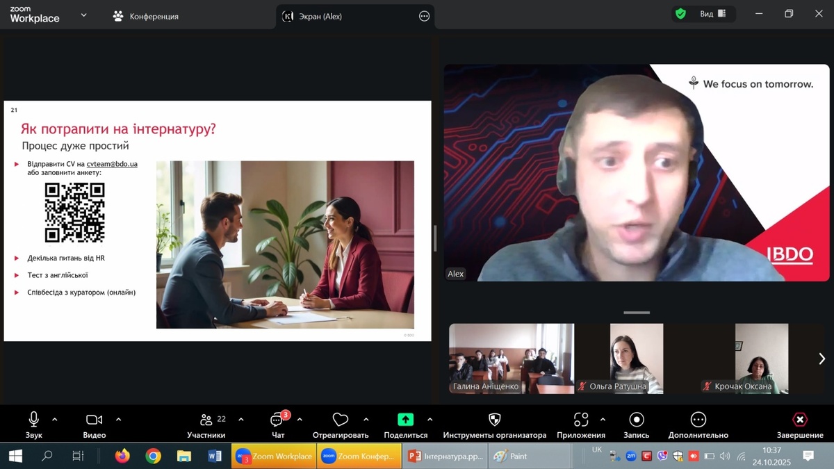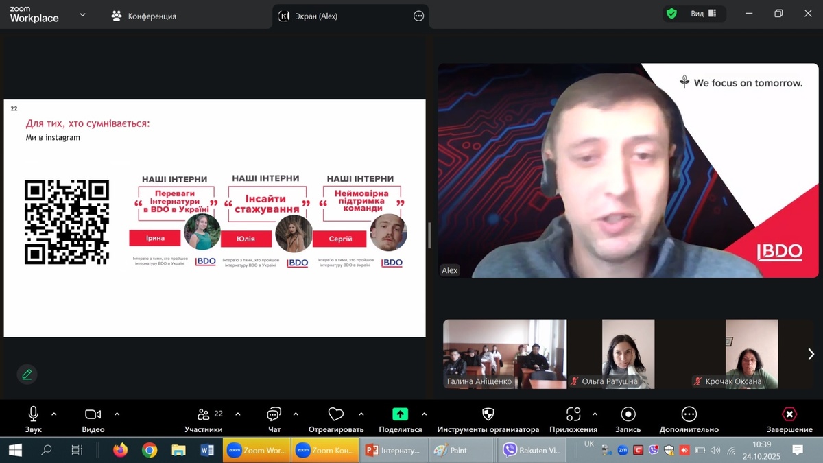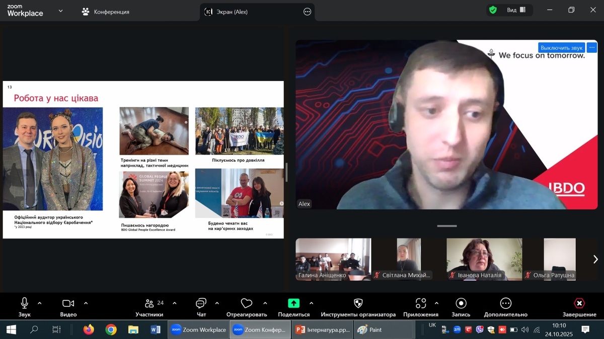 Компанія BDO в Україні є акредитованим роботодавцем ACCA і CIMA, а також золотим партнером Microsoft, що впроваджує інноваційні рішення у бізнес-процеси. Студенти дізналися про можливості участі у проєктах з відновлення України, тренінгах із ментального здоров’я, а також про переваги корпоративного страхування.