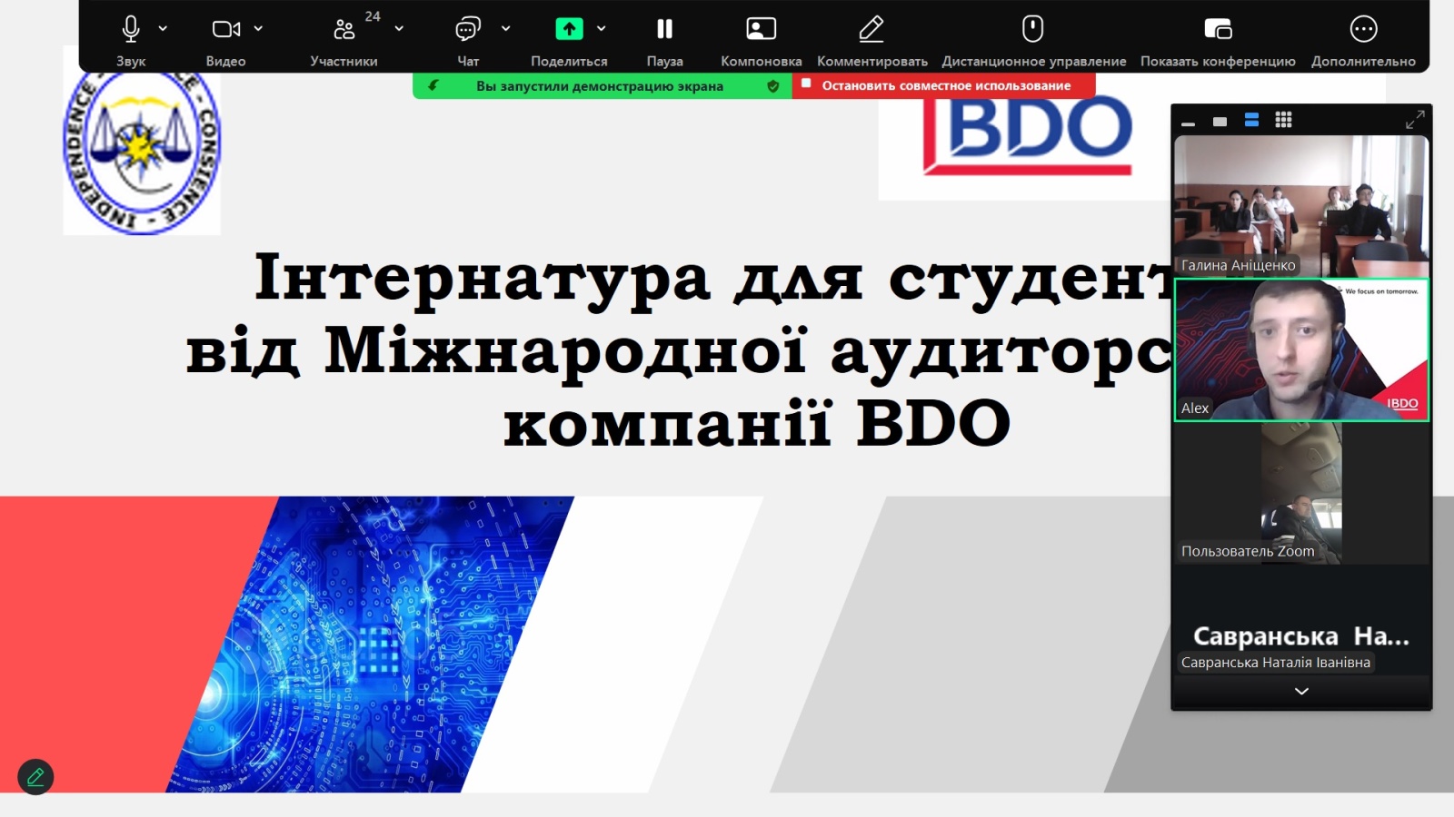 Спікерами заходу стали Олексій Кузнєцов та Віра Савченко - ментори та керівники команди BDO. Вони представили студентам реальні можливості стажування, офіційного працевлаштування та кар’єрного зростання у сфері аудиту й бухгалтерського обліку.