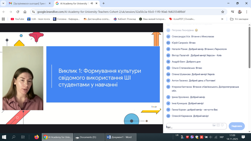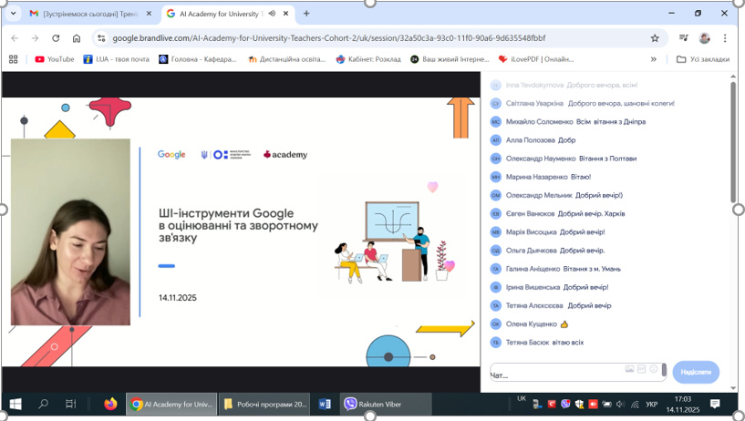 Навчання тривало з 29 жовтня до 21 листопада 2025 року і проходило у дистанційному форматі. Лекції та практичні сесії включали роботу з інструментами Gemini, NotebookLM, Deep Search, Google AI Studio, а також розглядали питання етичного використання ШІ, зворотного зв’язку, оцінювання знань студентів та створення ШІ-резистентних завдань.