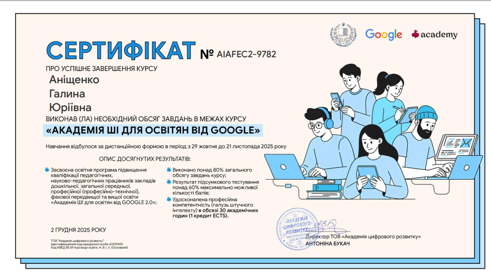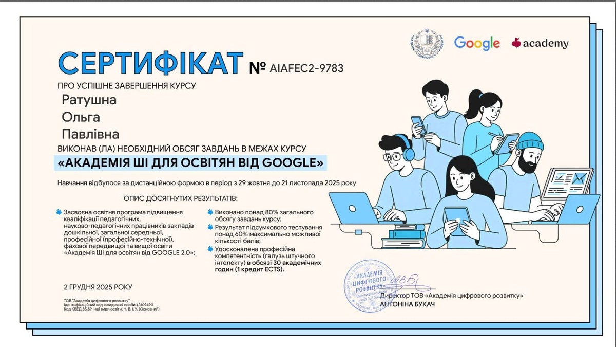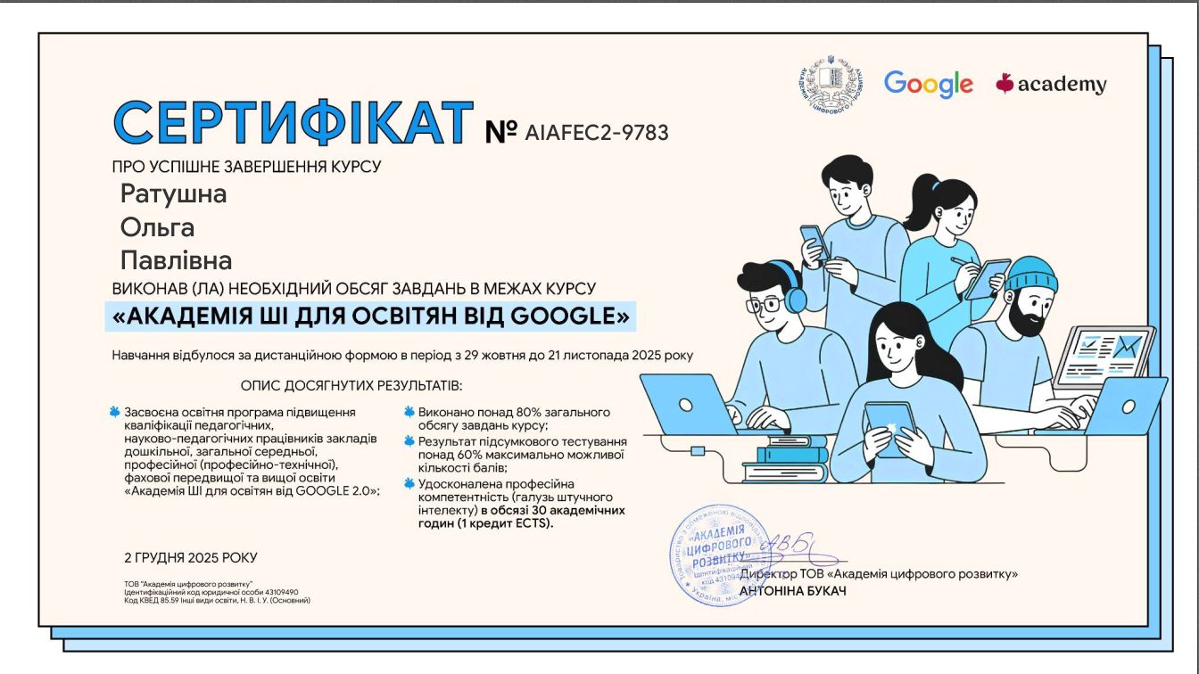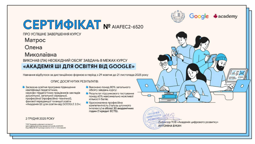 Доценти кафедри обліку і оподаткування Уманського національного університету успішно завершили освітню програму «Академія ШІ для освітян 2.0 від Google», спрямовану на формування цифрових компетентностей та інтеграцію інструментів штучного інтелекту в сучасну педагогічну діяльність.