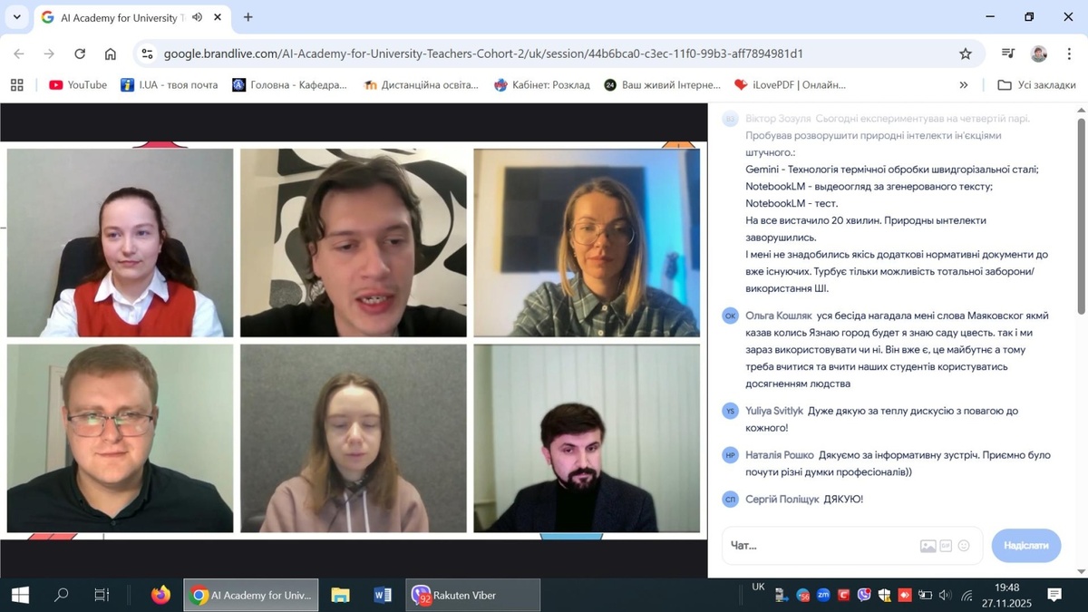 Під час навчальних сесій учасники брали участь у групових обговореннях, отримували практичні кейси щодо використання ШІ в оцінюванні, консультативній підтримці студентів та підготовці інтерактивних матеріалів. Значну увагу було приділено формуванню культури свідомого використання ШІ в навчанні, академічній доброчесності та розвитку критичного мислення.
