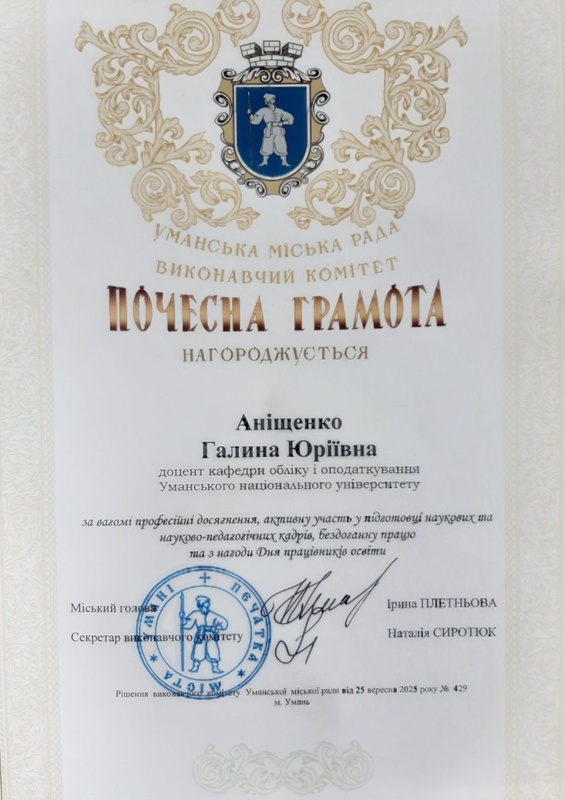 Почесною грамотою Виконавчого комітету Уманської міської ради за вагомі професійні досягнення, активність та бездоганну працю була нагороджена доцент кафедри Галина АНІЩЕНКО.