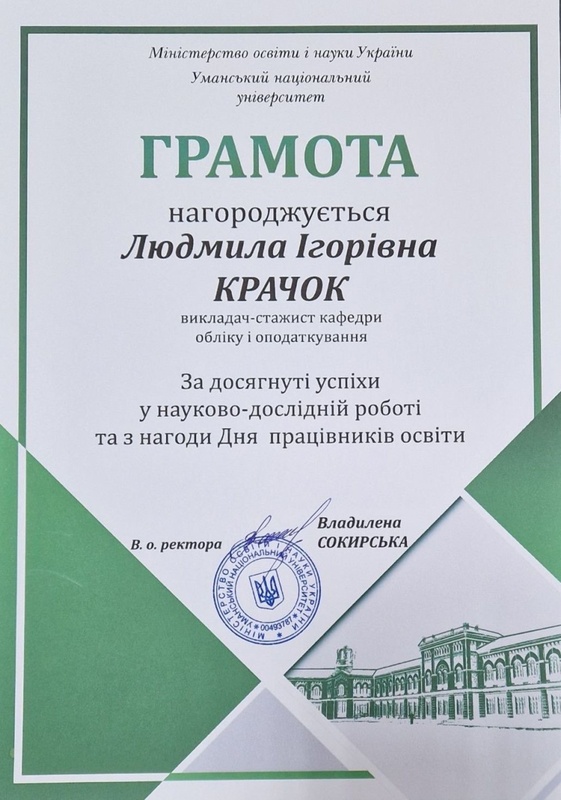 Грамотою Уманського національного університету за досягнуті успіхи у науково-дослідній роботі нагороджена викладач-стажист Людмила КРАЧОК.